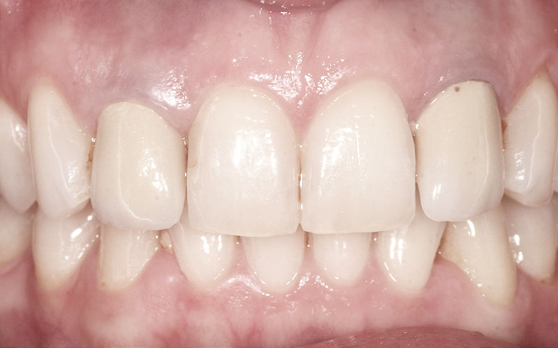 Replacement of 2 missing lower molars with 2 dental implant-supported crowns. The patient had been missing these teeth for many years. During this time, the hard, protective gingival (gum) tissue that normally supports teeth had disappeared. A soft tissue graft was placed at this site to replace the missing gingival tissue. The implants were then placed. The end result was 2 molar implant crowns, surrounded by a thick band of healthy gingival tissue. This tissue will help prevent bone loss around the implants in the future.